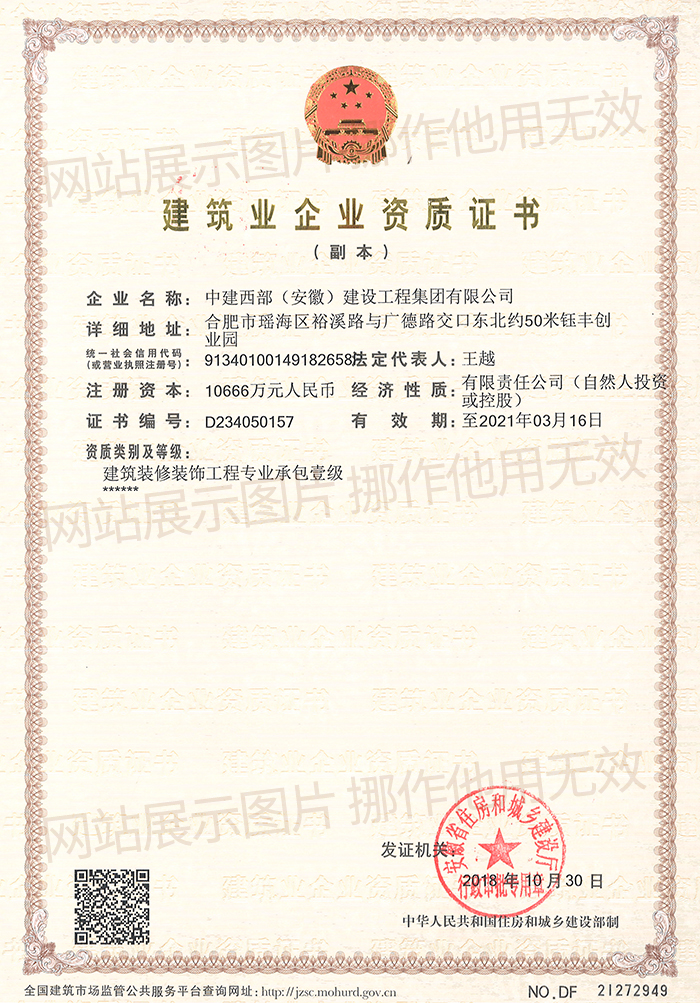 2018年10月,星空·体育顺利地通过了建筑工程企业资质的审查,是公司继建筑工程施工总承包壹级、市政公用工程施工总承包叁级资质之后,取得了建筑装修装饰工程专业承包壹级资质。