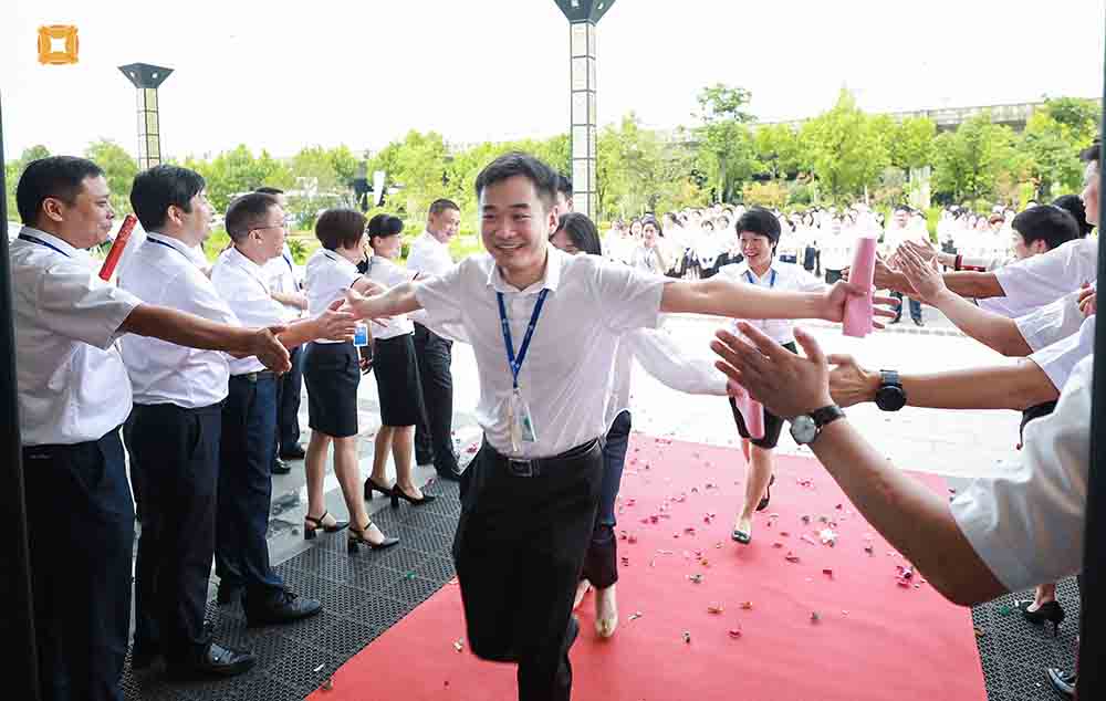 上午10时,员工在集团总部大楼广场集合,管理团队等候在红毯两侧,与迎面而来的多金奋斗者击掌相庆,在签到板上印下纪念章签名,司庆庆祝早会就此拉开序幕。