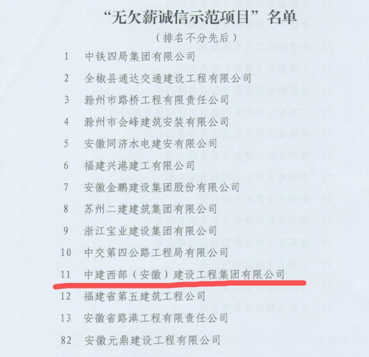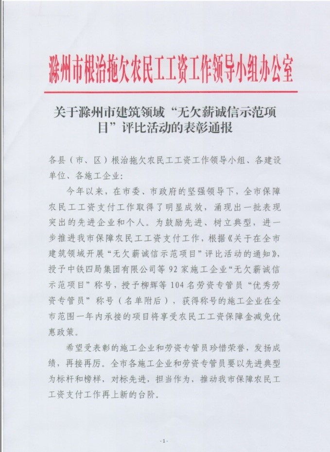近日,喜报连连,中建西部集团承建滁州奥特莱斯仪邦项目获评滁州市建筑领域“无欠薪诚信示范项目”。滁州市根治拖欠农民工工资工作领导小组办公室印发《关于滁州市建筑领域“无欠薪诚信示范项目”评比活动的表彰通报》,对我司获评进行了表彰通报。