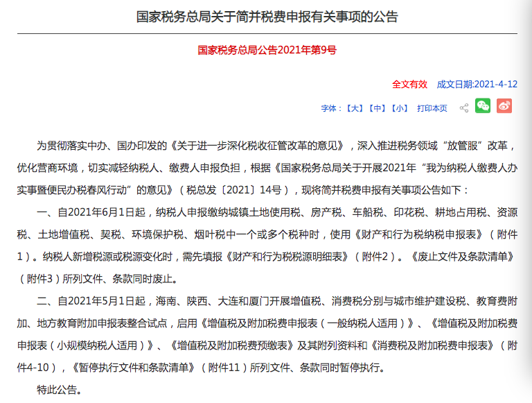 2021年5月1日起,在海南、陕西、大连、厦门4个省市开展增值税、消费税分别与附加税费申报表整合试点。税务总局将根据试点情况,2021年适时在全国推开。