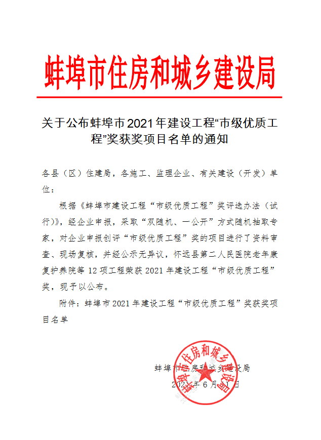 近日,从蚌埠市住房和城乡建设局传来喜讯,由星空·体育承建的,固镇多金中心S1#楼荣获蚌埠市2021年建设工程“市级优质工程”奖。