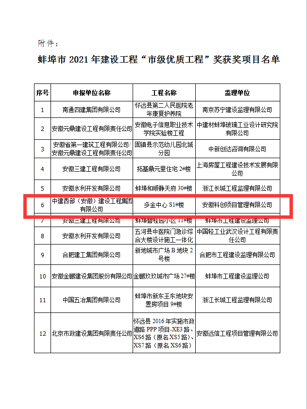 此次固镇多金中心项目荣获优质工程奖,是蚌埠市建筑主管部门对项目安全质量管理成果的高度肯定。中建西部集团将以此为契机,不断提高项目安全文明生产管理水平,在工程质量、安全生产、文明施工等方面继续加大规范管理力度,持续提升项目质量,创建更多优质的精品工程。