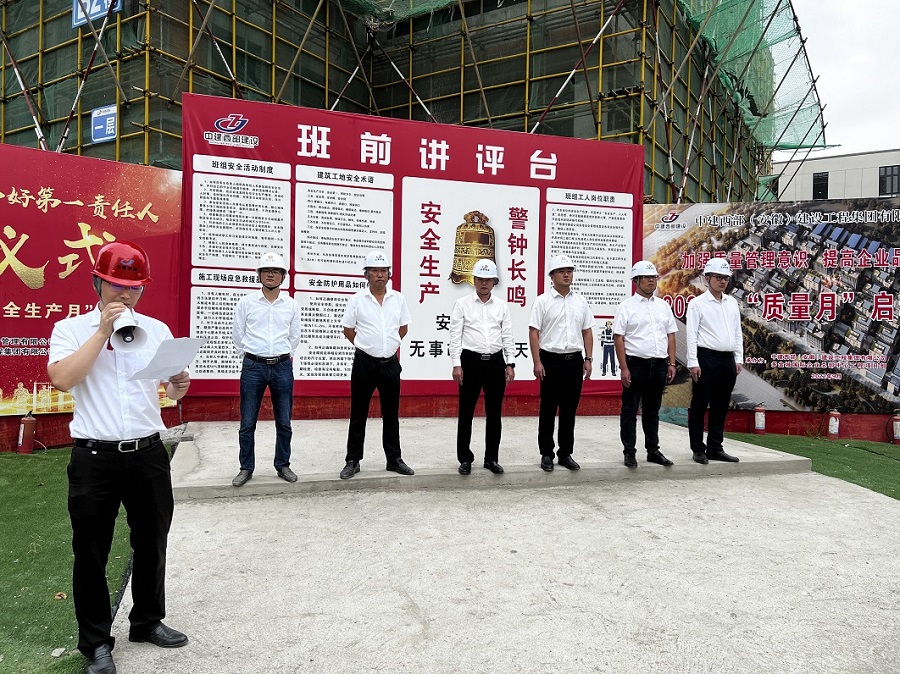 仪式上,中建西部建设集团领导阐述了开展“质量月”活动的重要意义,宣读了项目部开展2022年“质量月”活动的实施方案,并提出了四点工作要求: 一是周密部署,精心策划。各单位要进一步树立“至精”发展理念,增强质量责任意识,围绕质量月活动实施计划,因地制宜的开展有成色、有亮点、接地气的活动。二是不走过场,重心下移。各单位要按照活动的总体要求,充分发挥活动主力军作用,广泛动员班组、工人参与,将各项活动落到实处。三是正视问题,立行立改。各单位要以问题为导向,认真检视质量管理工作中存在的薄弱环节和突出问题,编制问题清单,剖析根源,制定措施,限期整改。四是不断创新,务求实效。各单位要全方位、多角度开展“质量月”宣传和策划活动,力争把“ 质量月”活动办成推动质量工作、展示质量成果的平台,提高“质量月”活动实效。
