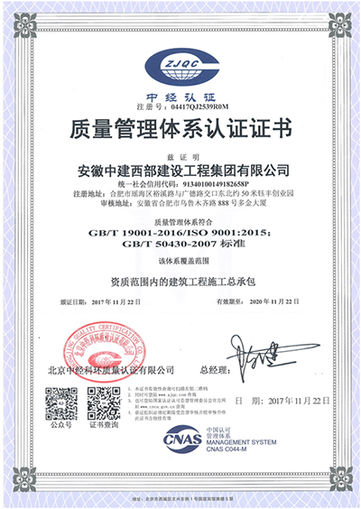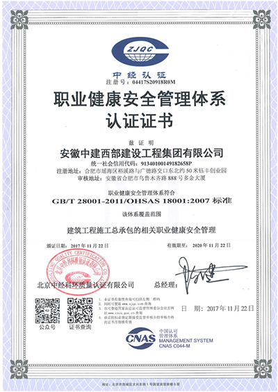 2017年11月14日上午9时,安徽中建西部建设集团工程有限公司顺利通过了由北京中经科环质量认证有限公司组成的专家审核组的质量、环境、职业健康安全“四标一体化”管理体系认证审核。